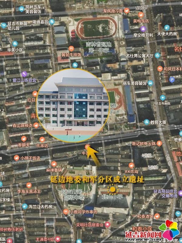 延邊地委和軍分區成立遺址位于現在延吉市北山小學。延邊人民武裝建立初期,由抗聯分遣隊、關內朝鮮義勇軍進駐延邊擴建的部隊,由黨中央派干部建立延吉軍分區。