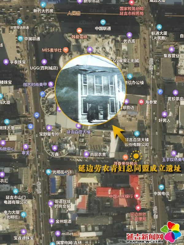 勞農青婦總同盟成立遺址位于今延吉市光明街延邊電業局(北側大街東)。